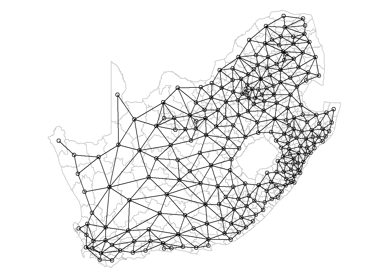 coords <-st_centroid(municipal, of_largest_polygon =TRUE)pts <-st_coordinates(coords)par(mai =c(0, 0, 0, 0)) # Remove the margins and white space around the plotplot(st_geometry(municipal), border ="grey")plot(neighbours, pts, add = T)