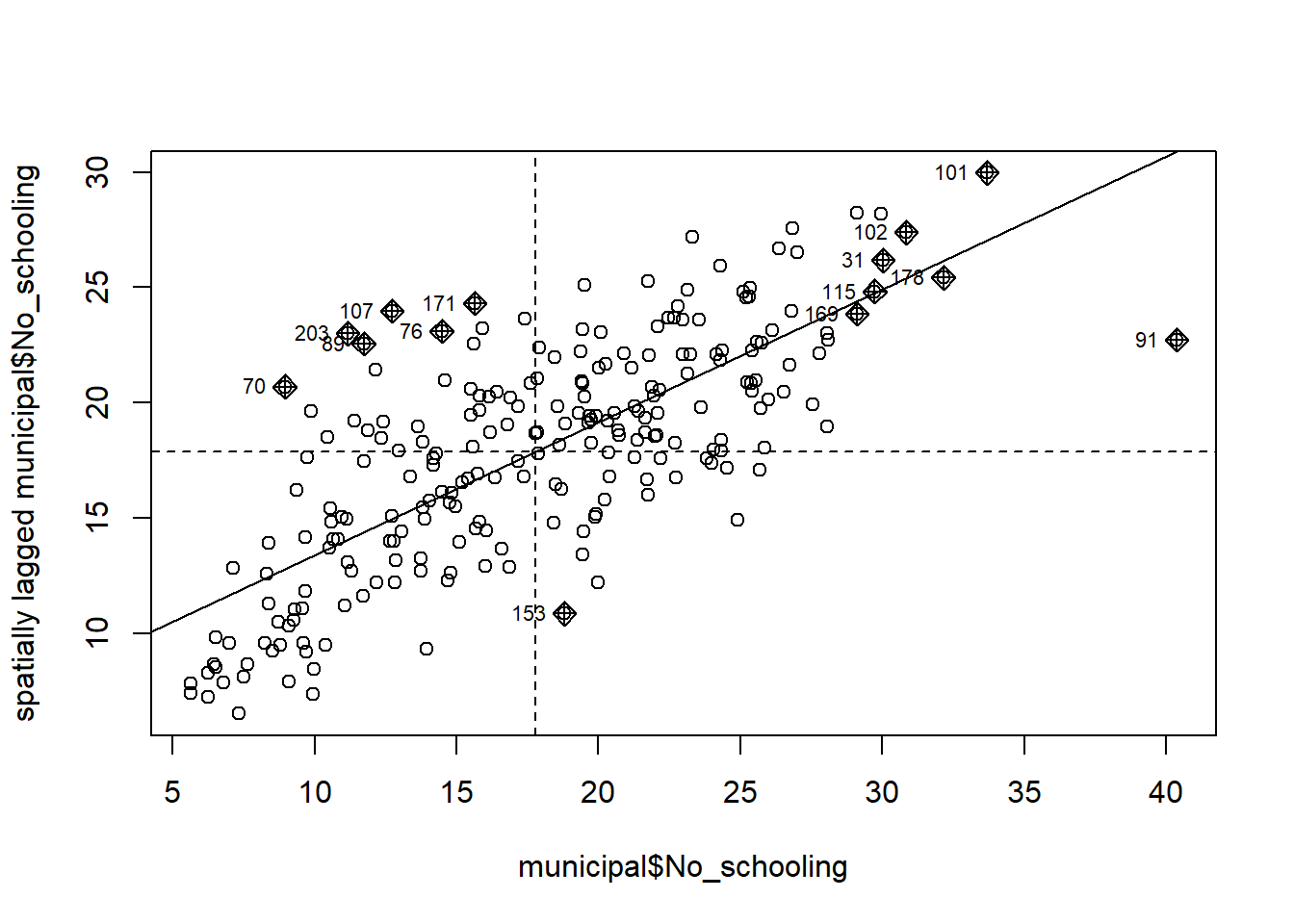 # Return the plot margins to their default values in R:par(mai=c(1.02,0.82,0.82,0.42))moran.plot(municipal$No_schooling, spweight)