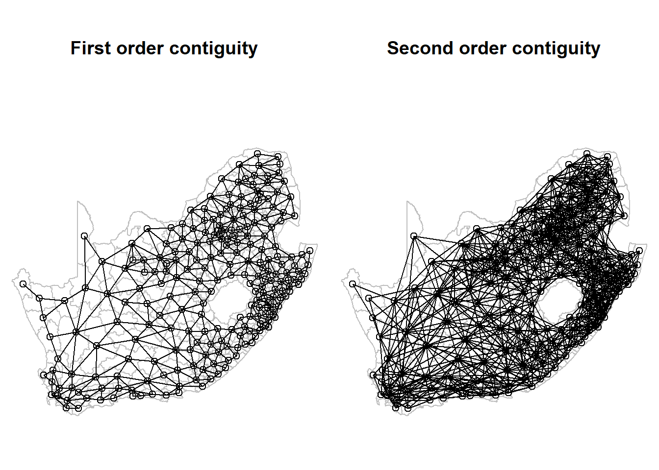 neighbours <-nblag(neighbours, maxlag =2)par(mai =c(0, 0, 1, 0))par(mfrow =c(1,2)) # Plot graphics in a 1 row by 2 column gridplot(st_geometry(municipal), border ="grey", main ="First order contiguity")plot(neighbours[[1]], pts, add = T)plot(st_geometry(municipal), border ="grey", main ="Second order contiguity")plot(neighbours[[2]], pts, add = T)
