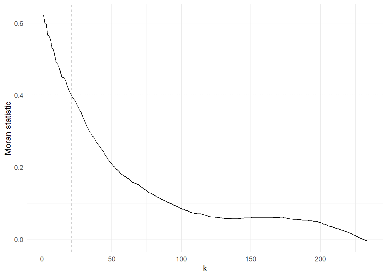 threshold_k <-max(which(I >0.4))cat("\nThe maximum value of k for a Moran value greater than 0.4 is ", threshold_k, "\n")
