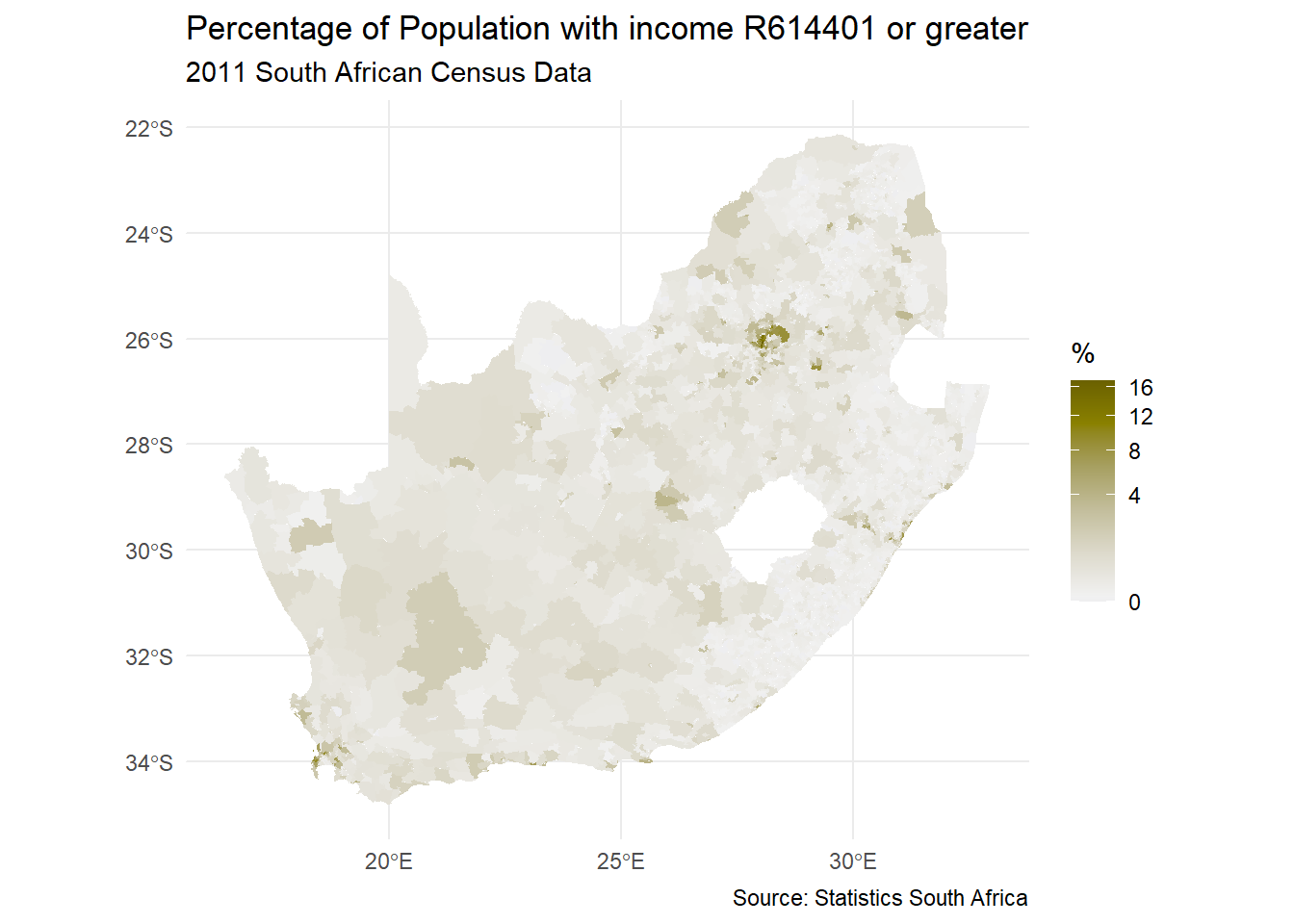 download.file("https://github.com/profrichharris/profrichharris.github.io/blob/main/MandM/workspaces/wards.RData?raw=true", "wards.RData", mode ="wb", quiet =TRUE)load("wards.RData")ggplot(data = wards, aes(fill = High_income)) +geom_sf(colour ="transparent") +scale_fill_continuous_c4a_div(name ="%", palette ="hcl.blue_yellow2",trans ="sqrt", mid =median(wards$High_income)) +theme_minimal() +labs(title ="Percentage of Population with income R614401 or greater",subtitle ="2011 South African Census Data",caption ="Source: Statistics South Africa" )