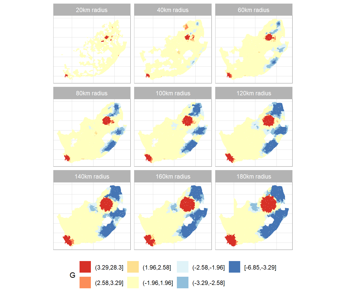 # Sets the threshold distance from 20 to 180km in intervals of 20# I chose 9 distances because they can be shown in a 3 x 3 grid of mapsd <-seq(from =20, by =20, length.out =9)# Calculate the G statistics for each distance and save them# as a list of sf features (maps)coords <-st_centroid(wards, of_largest_polygon =TRUE)maps <-suppressWarnings(lapply(d, \(x) { neighbours <-dnearneigh(coords, 0, x) spweight <-nb2listw(neighbours, style ="B", zero.policy =TRUE) wards$localG <-localG(wards$High_income, spweight) wards$distance <- xreturn(wards) }))# Bind the maps together into a single object to be used# for the faceting in ggplot2maps <-do.call(rbind, maps)brks <-c(min(maps$localG, na.rm =TRUE),-3.29, -2.58, -1.96, 1.96, 2.58, 3.29,max(maps$localG, na.rm =TRUE))maps$localG_gp <-cut(maps$localG, brks, include.lowest =TRUE)# This function is used with the labeller argument in the# facet_wrap function to customise the title of each sub-plotfacet_labels <- \(x) paste0(x, "km radius")ggplot(data = maps, aes(fill = localG_gp)) +geom_sf(colour =NA) +scale_fill_discrete_c4a_div(name ="G", palette ="brewer.rd_yl_bu",reverse =TRUE, na.translate =FALSE) +facet_wrap(~ distance, labeller =labeller(distance = facet_labels)) +theme_light() +theme(axis.title.x =element_blank(), axis.title.y =element_blank(),axis.ticks.x =element_blank(), axis.ticks.y =element_blank(),axis.text.x =element_blank(), axis.text.y =element_blank(),legend.position ="bottom") +guides(fill =guide_legend(reverse =TRUE))