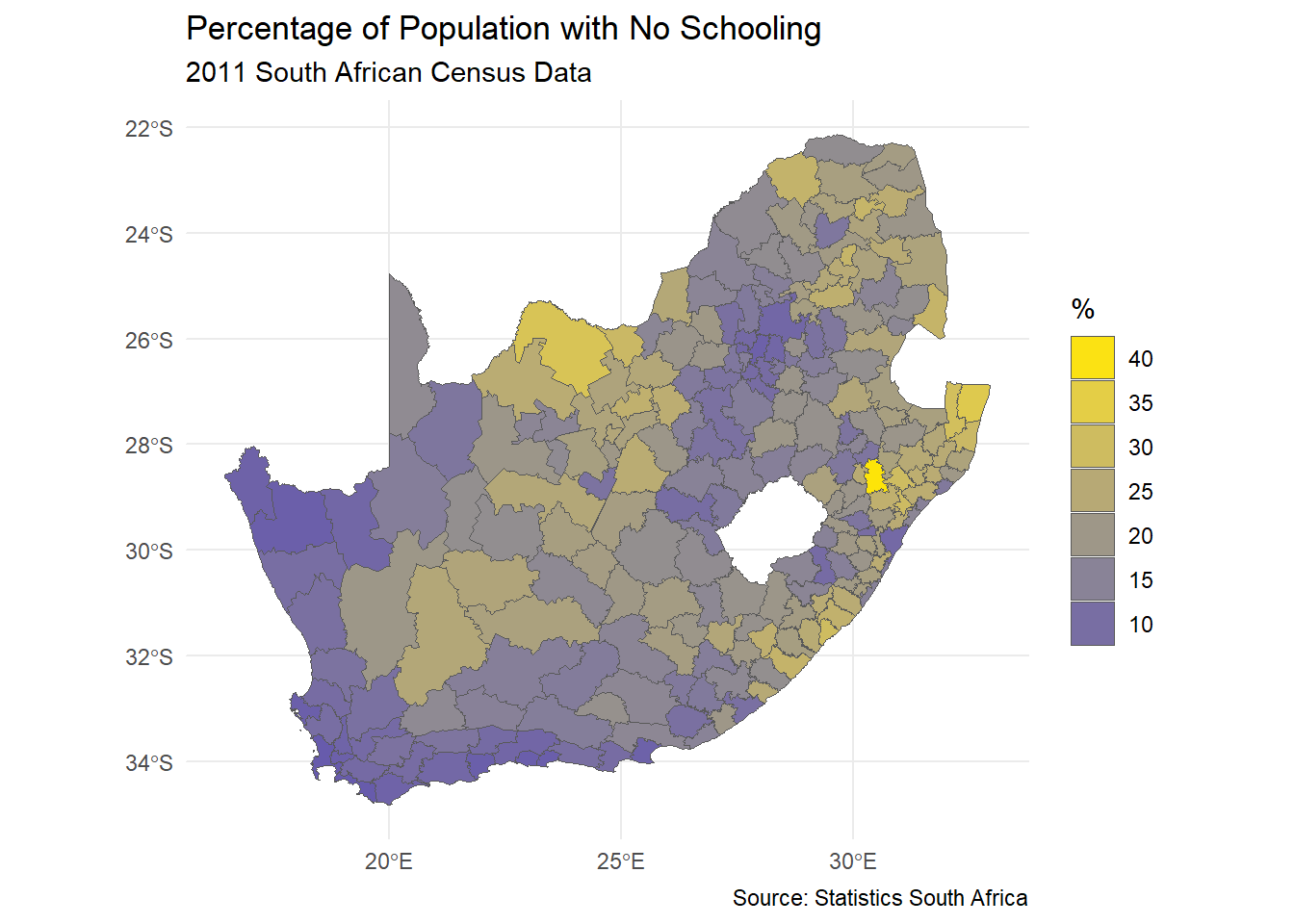 installed <-installed.packages()[,1]pkgs <-c("tidyverse", "sf", "RColorBrewer", "classInt", "ggplot2")install <- pkgs[!(pkgs %in% installed)]if(length(install)) install.packages(install, dependencies =TRUE)invisible(lapply(pkgs, require, character.only =TRUE))if(!file.exists("municipal.RData")) download.file("https://github.com/profrichharris/profrichharris.github.io/blob/main/MandM/workspaces/municipal.RData?raw=true", "municipal.RData", mode ="wb")load("municipal.RData")brks <-classIntervals(municipal$No_schooling, n =7, style ="jenks")$brksmunicipal$No_schooling_gp <-cut(municipal$No_schooling, brks,include.lowest =TRUE)ggplot(data = municipal, aes(fill = No_schooling_gp)) +geom_sf() +scale_fill_brewer("%", palette ="RdYlBu", direction =-1) +theme_minimal() +theme(axis.title.x =element_blank(), axis.title.y =element_blank()) +guides(fill =guide_legend(reverse =TRUE)) +labs(title ="Percentage of Population with No Schooling",subtitle ="2011 South African Census Data",caption ="Source: Statistics South Africa" )