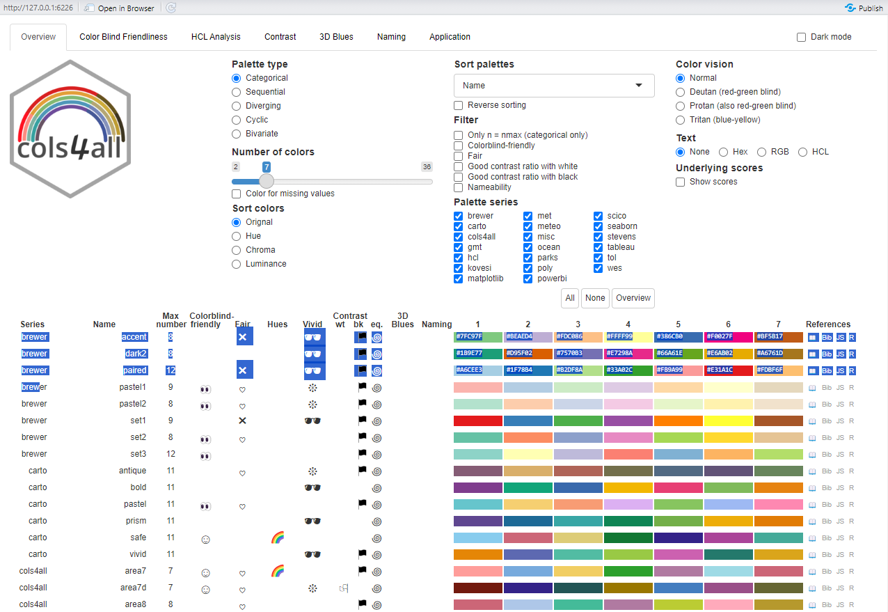 If we now activate its dashboard, we can learn a lot about different colour palettes and whether, for example, they are colour-blind friendly (try opening in browser if the dashboard does not load properly but that option appears).
