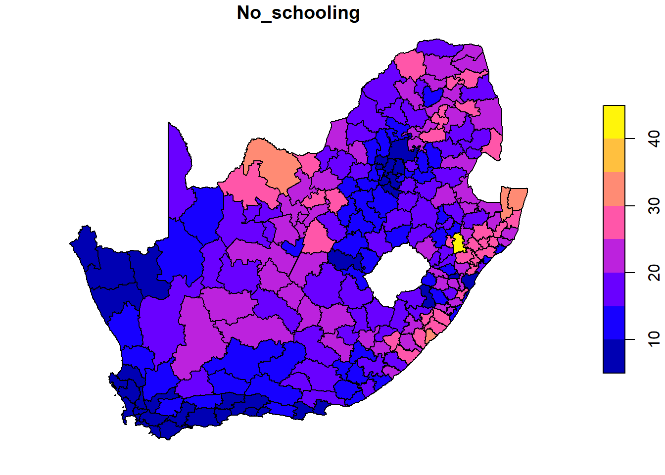 As a ‘rough and ready’ way to check for spatial variation and patterns in the data, it is quick and easy. It is important to specify the variable(s) you wish to include in the plot – plot(municipal["No_schooling"]) in the example above – or else it will try and plot all of them in the map’s data, up to the value specified by the argument max.plot, which has a default of nine.