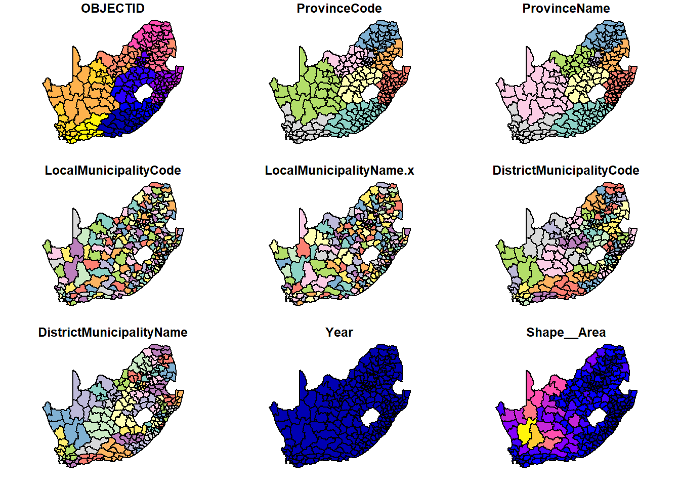 Note that the variables LocalMunicipalityName.x and LocalMunicipalityName.y have been created in the process of the join. This is because although we did not use LocalMunicipalityName for the join, that variable name is present in both the map and the data and is therefore duplicated when they are joined together – municipal$LocalMunicipalityName becomes municipal$LocalMunicipalityName.x and education$LocalMunicipalityName creates municipal$LocalMunicipalityName.y.