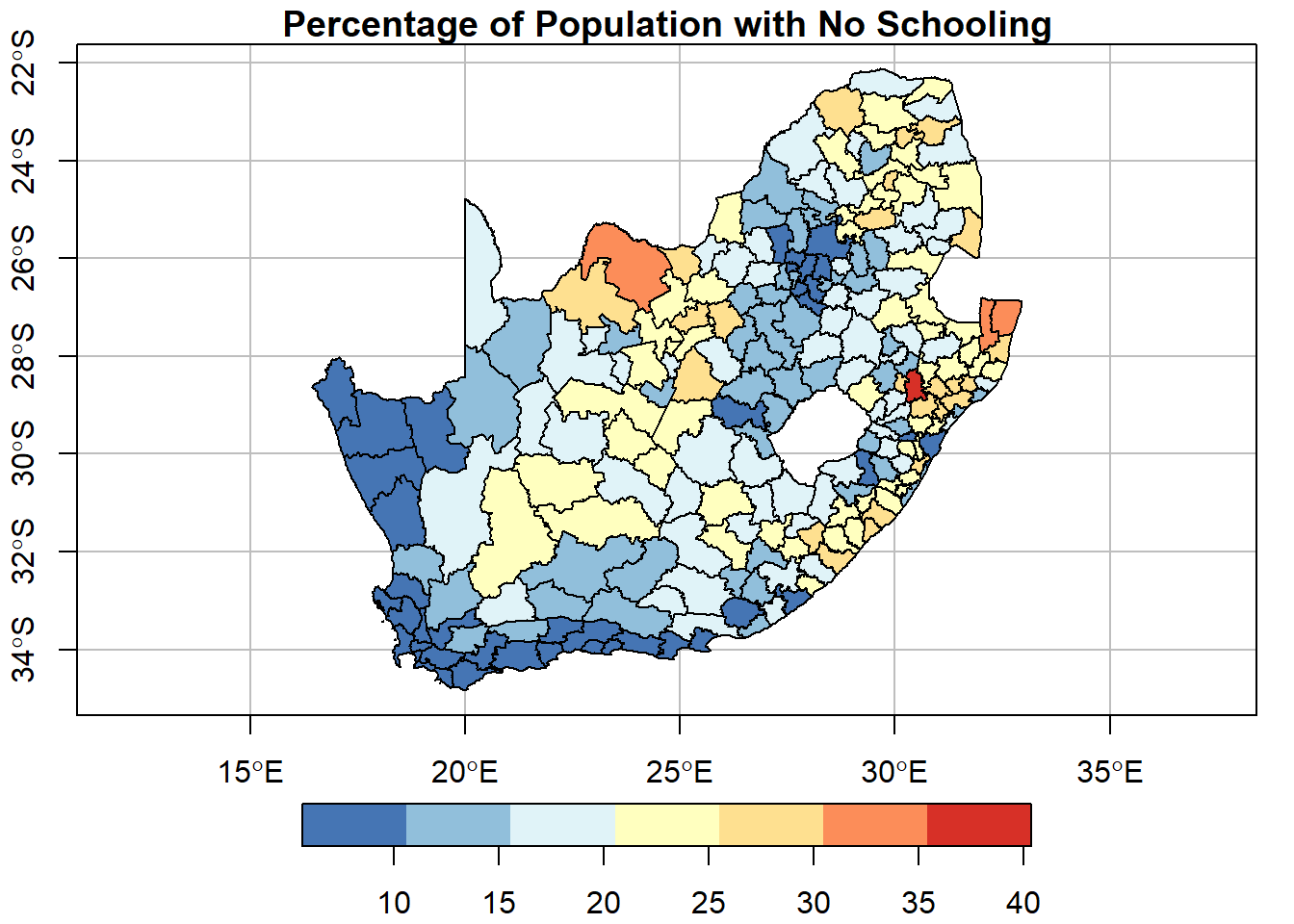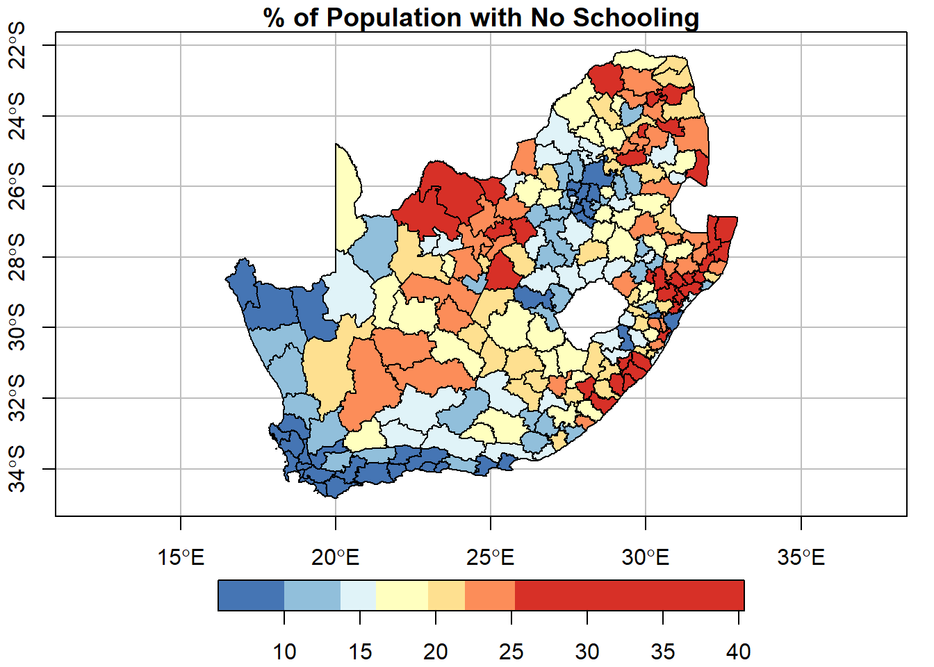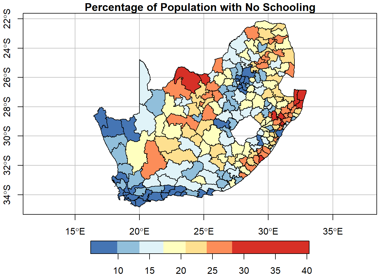 plot(municipal["No_schooling"], key.pos =1, breaks ="equal", nbreaks =7,pal =rev(brewer.pal(7, "RdYlBu")),graticule =TRUE, axes =TRUE,main ="Percentage of Population with No Schooling")