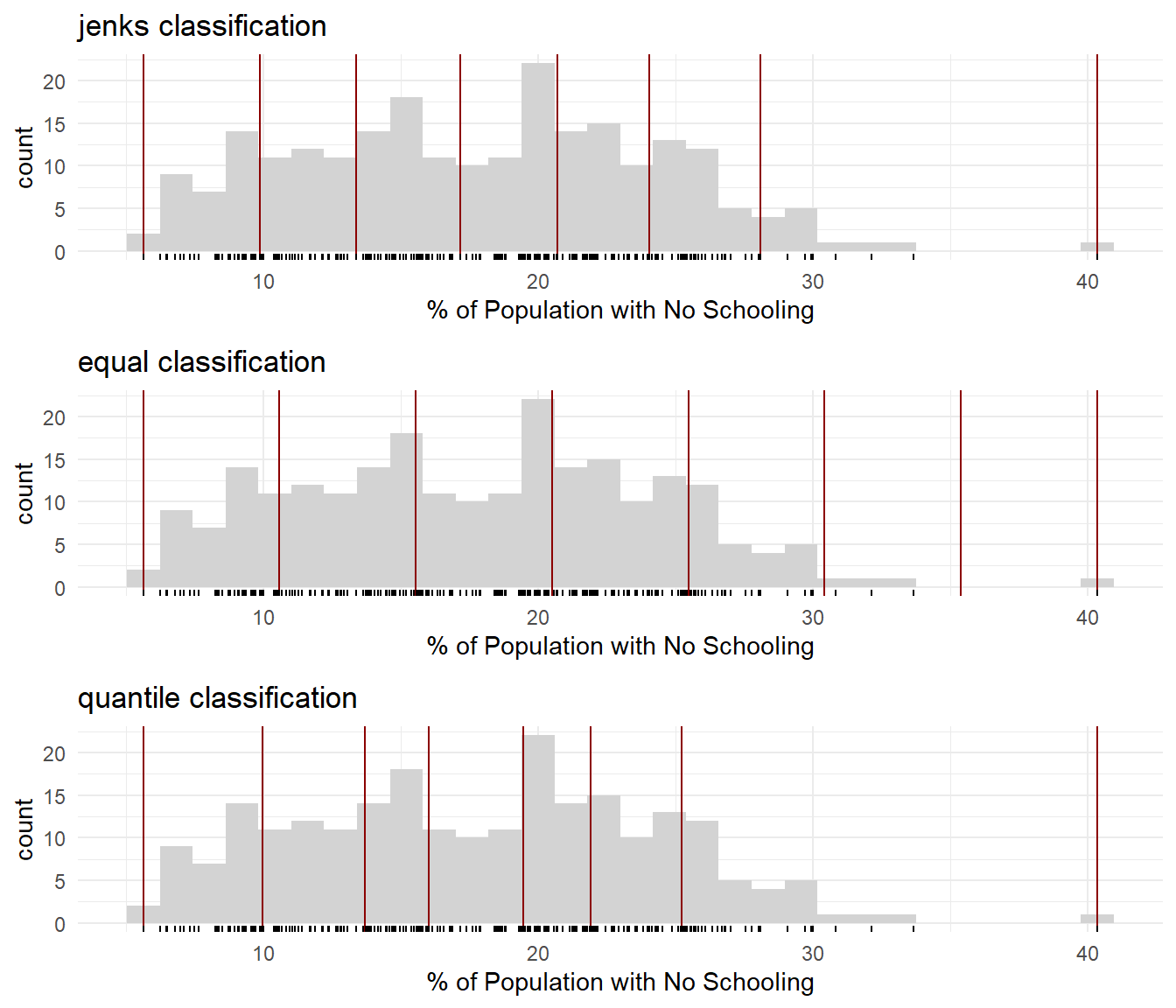 if(!("gridExtra"%in% installed)) install.packages("gridExtra",dependencies =TRUE)if(!("classInt"%in% installed)) install.packages("classInt",dependencies =TRUE)require(gridExtra)require(classInt)styles <-c("jenks", "equal", "quantile")g <-lapply(styles, \(x) {ggplot(municipal, aes(x = No_schooling)) +geom_histogram(fill ="light grey") +xlab("% of Population with No Schooling") +geom_vline(xintercept =classIntervals(municipal$No_schooling,n =7, style = x)$brks,col ="dark red") +geom_rug() +theme_minimal() +ggtitle(paste(x,"classification")) })# The step below brings together, in a grid, the list of three different plots# created abovegrid.arrange(grobs = g)