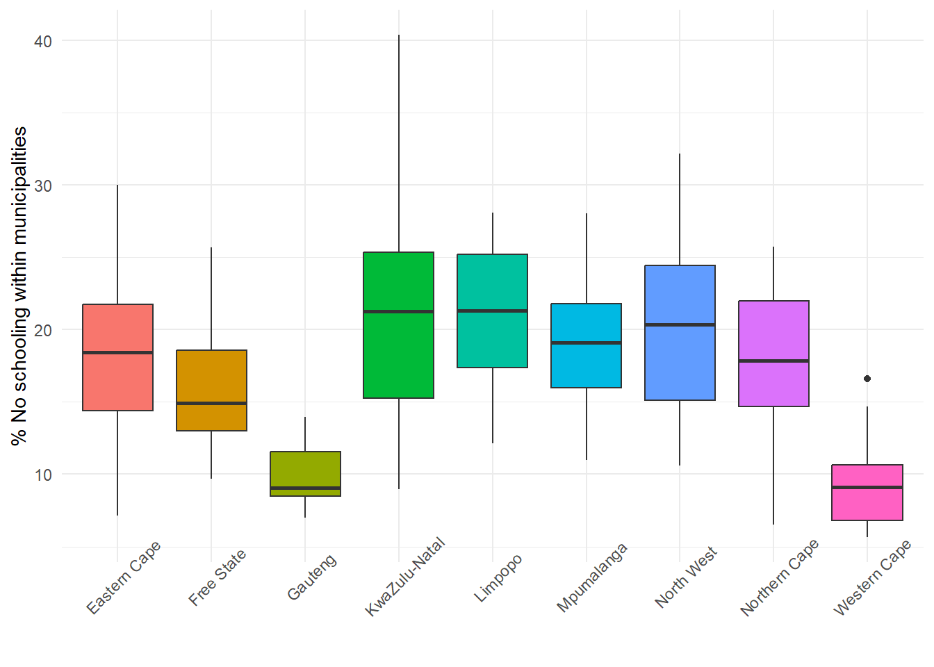 require(ggplot2)ggplot(data = municipal, aes(x = ProvinceName, y = No_schooling,fill = ProvinceName)) +geom_boxplot() +theme_minimal() +theme(legend.position ="none", axis.text.x =element_text(angle =45)) +xlab(element_blank()) +ylab("% No schooling within municipalities")