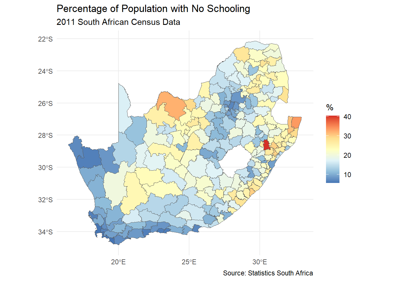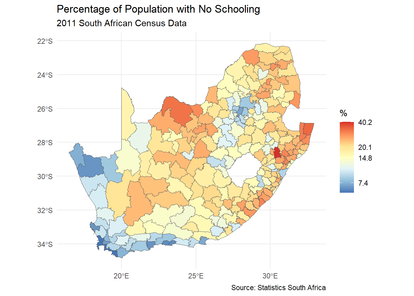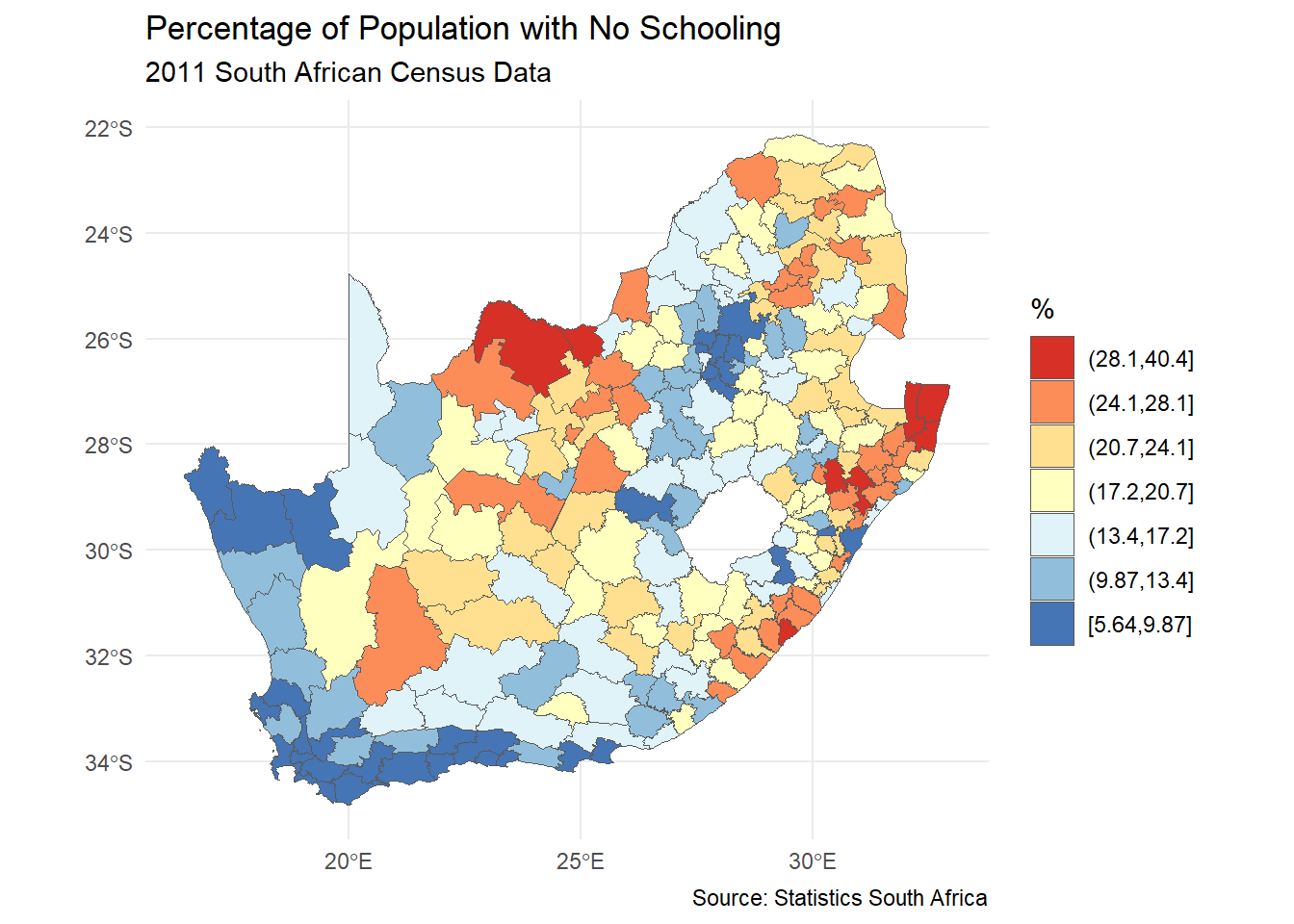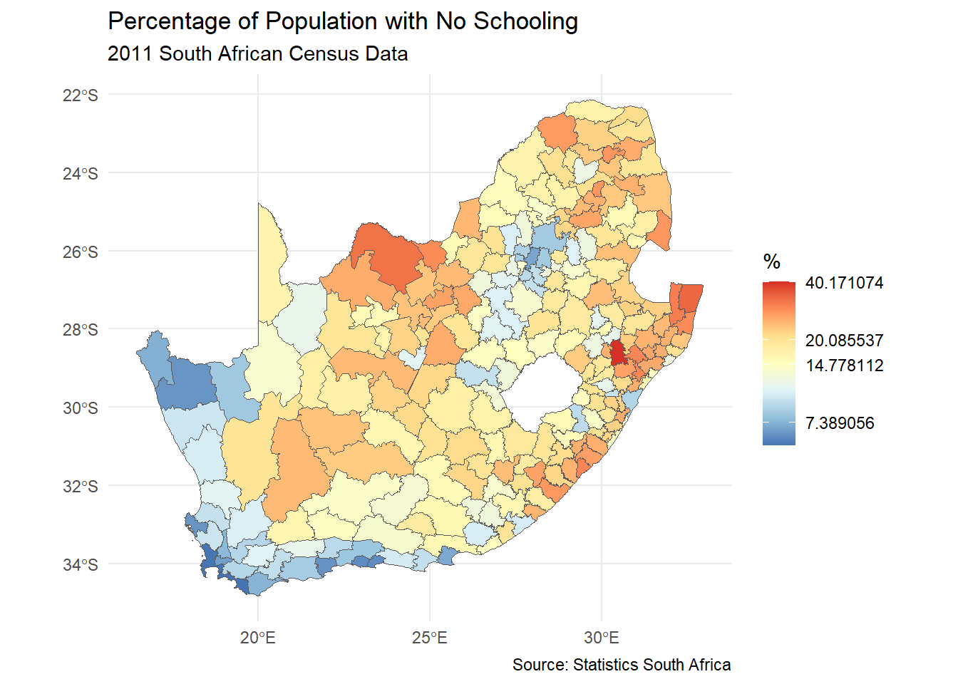ggplot(municipal, aes(fill = No_schooling)) +geom_sf() +scale_fill_distiller("%", palette ="RdYlBu", trans ="log", label = \(x) sprintf("%.1f", x)) +theme_minimal() +labs(title ="Percentage of Population with No Schooling",subtitle ="2011 South African Census Data",caption ="Source: Statistics South Africa" )