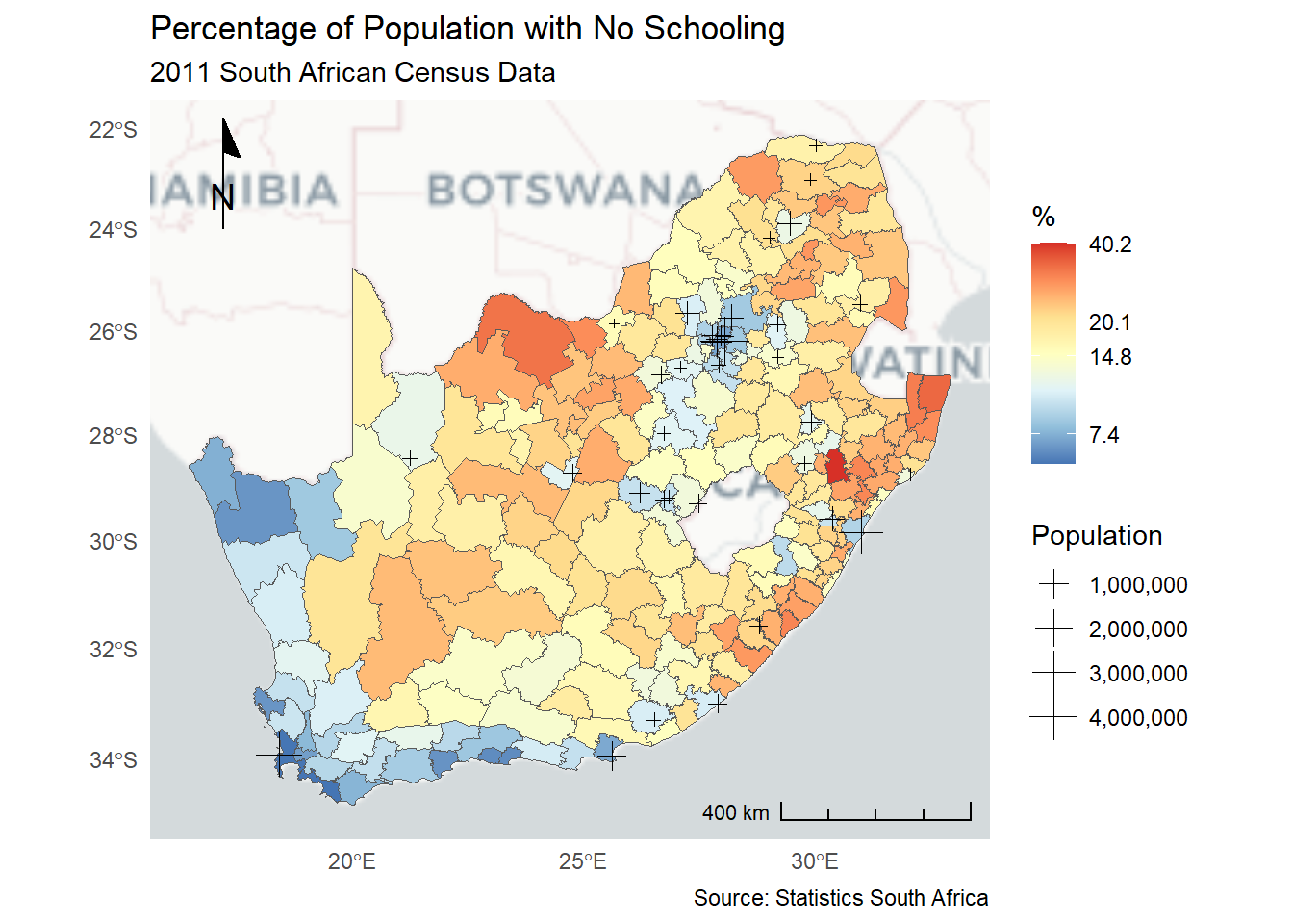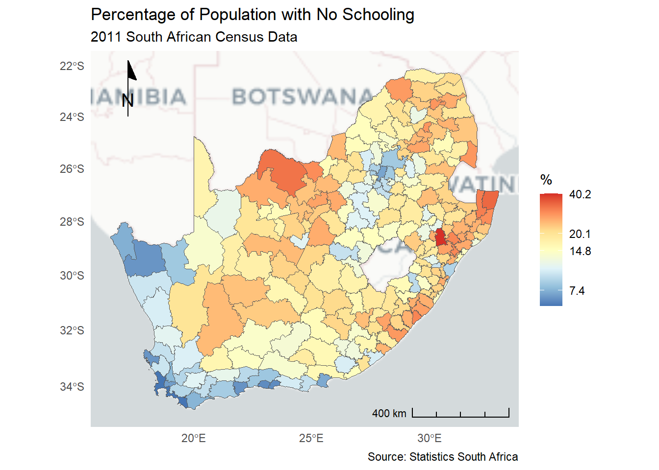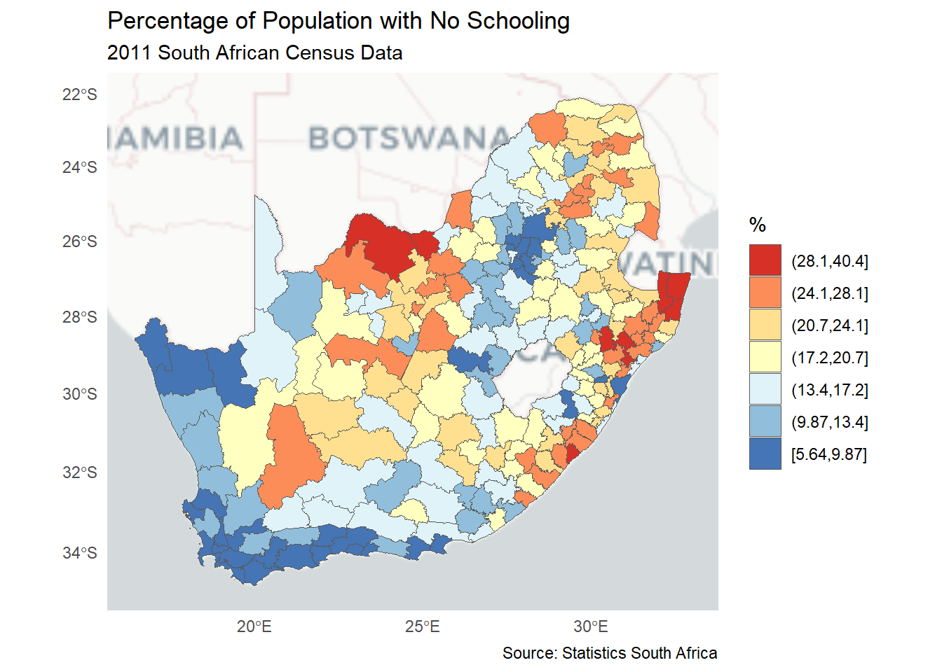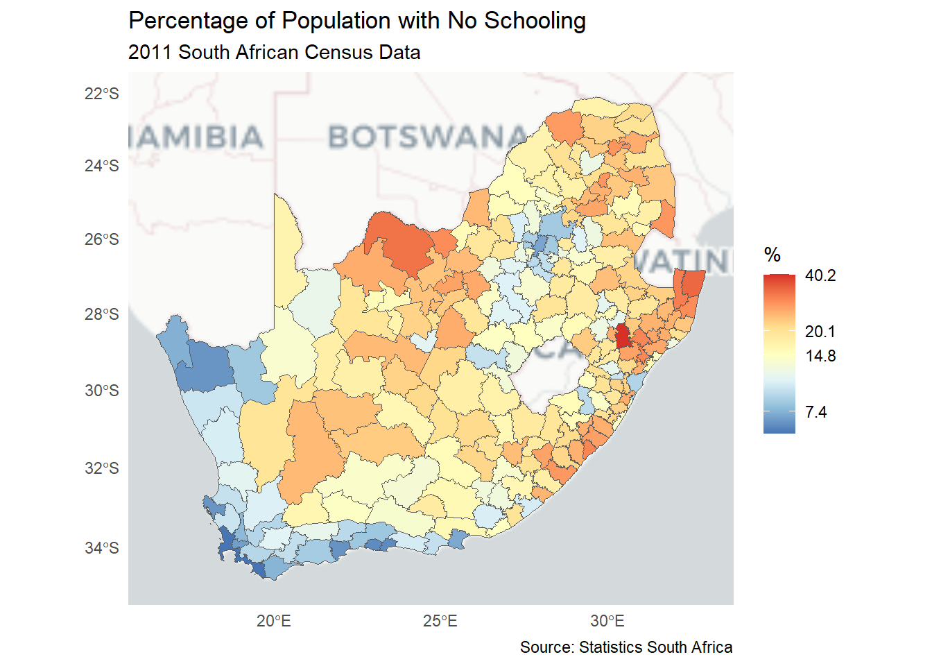 ggplot(municipal, aes(fill = No_schooling)) +geom_sf() +scale_fill_distiller("%", palette ="RdYlBu", trans ="log", label = \(x) sprintf("%.1f", x)) +theme_minimal() +labs(title ="Percentage of Population with No Schooling",subtitle ="2011 South African Census Data",caption ="Source: Statistics South Africa" )