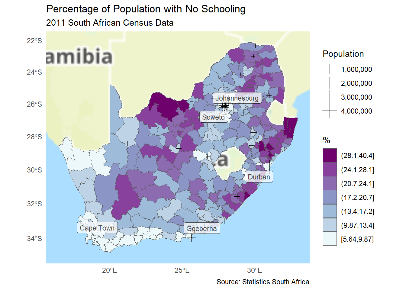 if(!("remotes"%in% installed)) install.packages("remotes", dependencies =TRUE)if(!("ggsflabel"%in% installed)) remotes::install_github("yutannihilation/ggsflabel")require(ggsflabel)ggplot() +annotation_map_tile(type ="thunderforestoutdoors", progress ="none") +geom_sf(data = municipal, aes(fill = No_schooling_gp)) +scale_fill_brewer("%", palette ="BuPu") +geom_sf(data = cities, aes(size = population), pch =3) +scale_size("Population", labels = scales::label_comma()) +geom_sf_label_repel(data = cities |>filter(population >1e6),aes(label = name), alpha =0.7, size =3) +theme_minimal() +# The line below removes some annoying axis titles that otherwise appeartheme(axis.title.x =element_blank(), axis.title.y =element_blank()) +guides(fill =guide_legend(reverse =TRUE)) +labs(title ="Percentage of Population with No Schooling",subtitle ="2011 South African Census Data",caption ="Source: Statistics South Africa" )