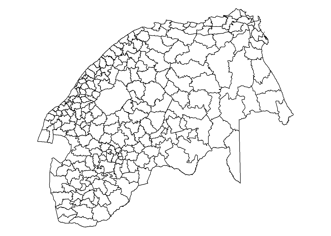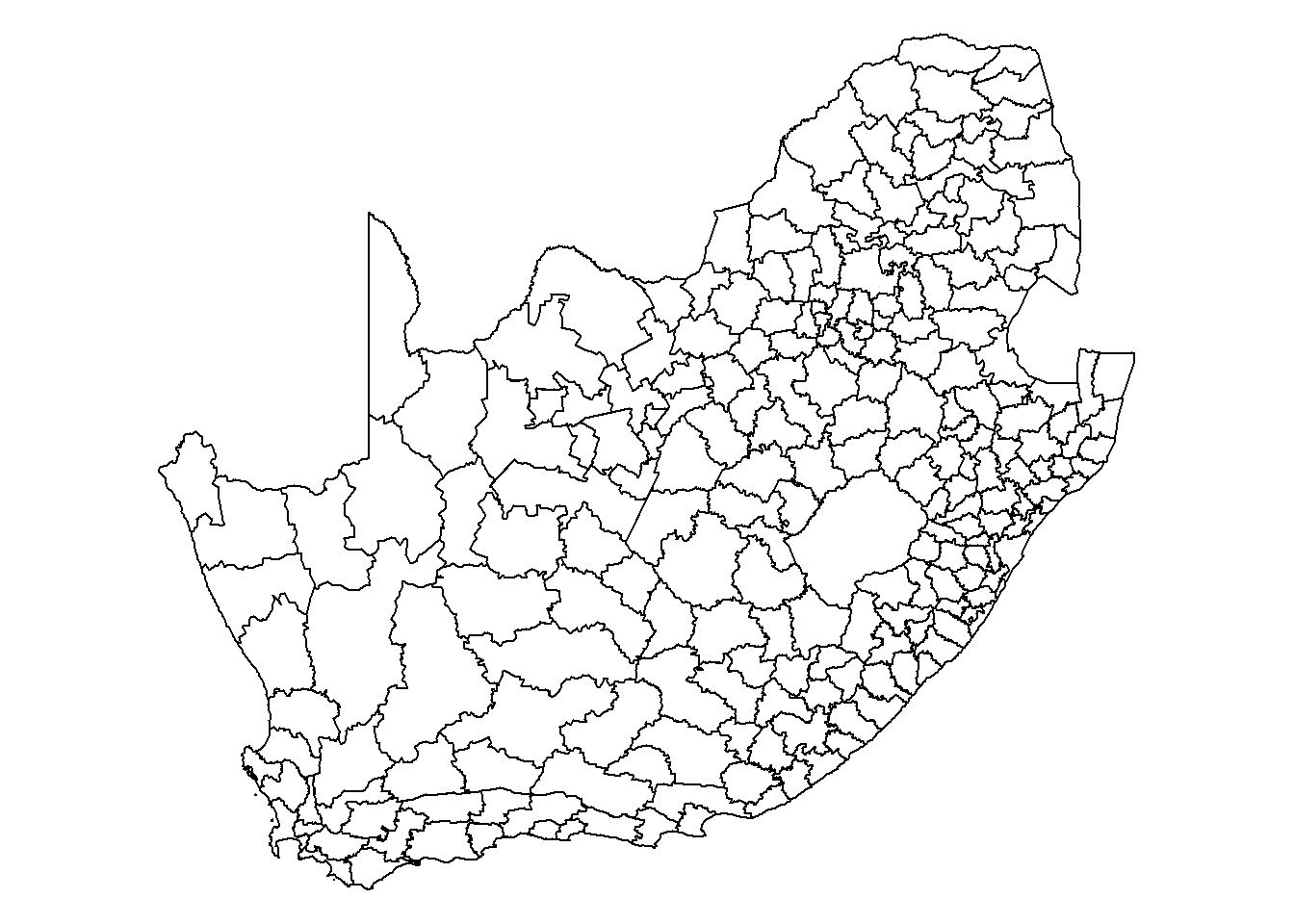 We have the data but now we need a ‘blank map’ of the same South African municipalities to map it. It is read-in below in geoJSON format but it would not have been unusual if it had been in .shp (shapefile) or .kml format, instead. The source of the data is https://dataportal-mdb-sa.opendata.arcgis.com/. There are several ways of reading this file into R but it is better to use the sf package because older options such as maptools::readShapePoly() (which was for reading shapefiles) or rgdal::readOGR are either deprecated already or in the process of being retired.
